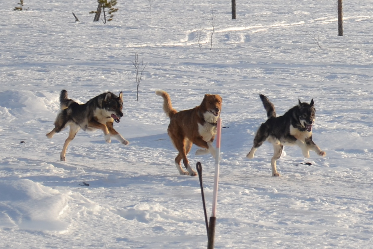 Die Hunde sind noch immer in sehr guter Form und sie zogen uns mühelos über die breiten Skoterwege...